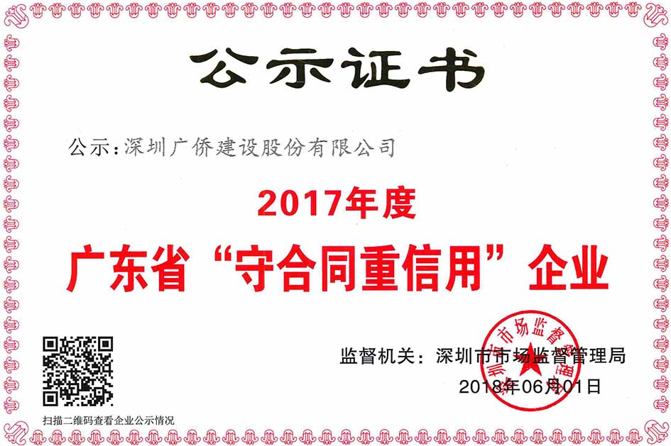 近日,广侨建设再次被评为“广东省守合同重信用企业”,企业多年来凭借坚持不懈地弘扬企业诚信经营理念, 自身完善的合同 管理制度,健全的合同信用管理体系,以及良好合同履约状况等企业诚信信用体系,成功的打造了企业良好信用环境和诚信经营品牌。